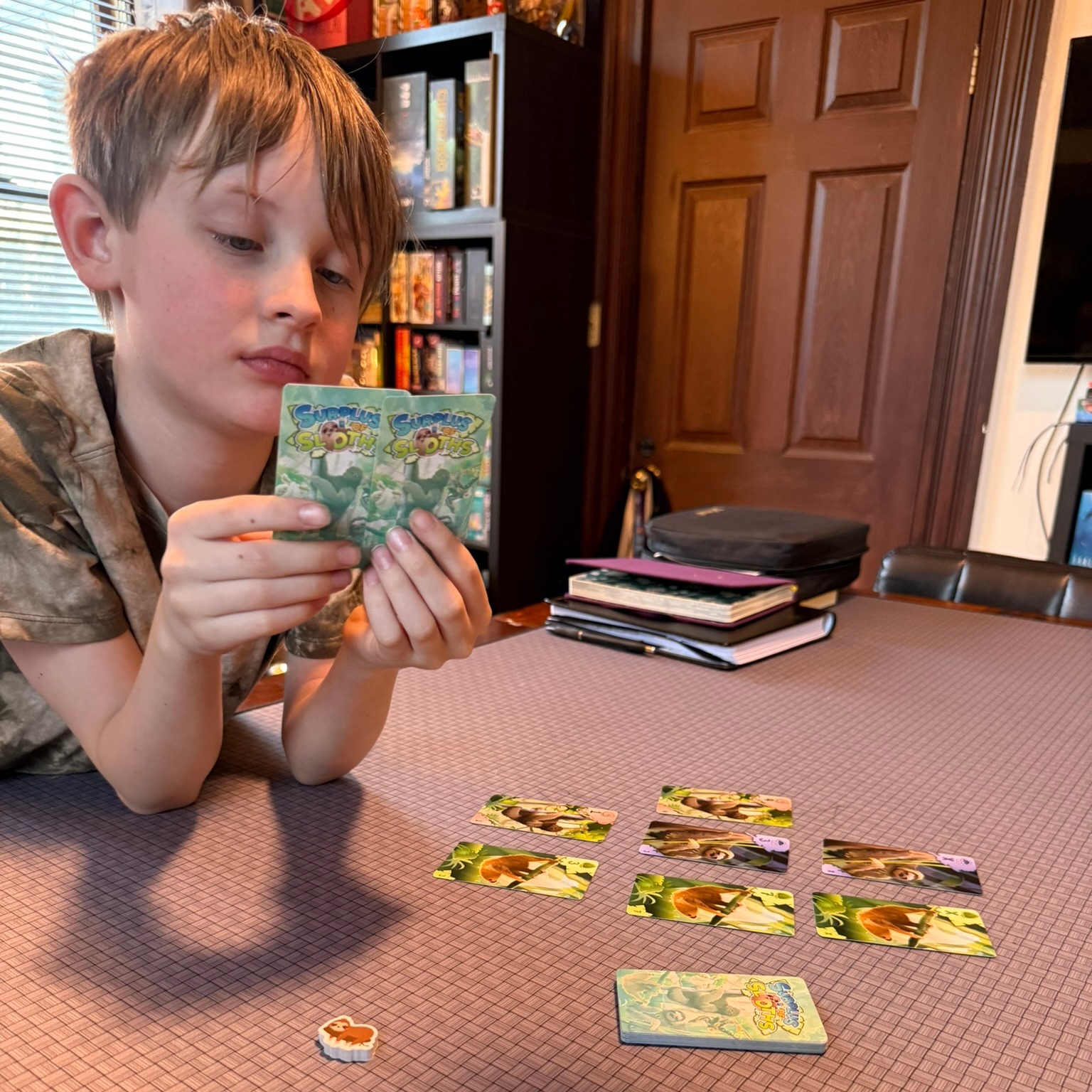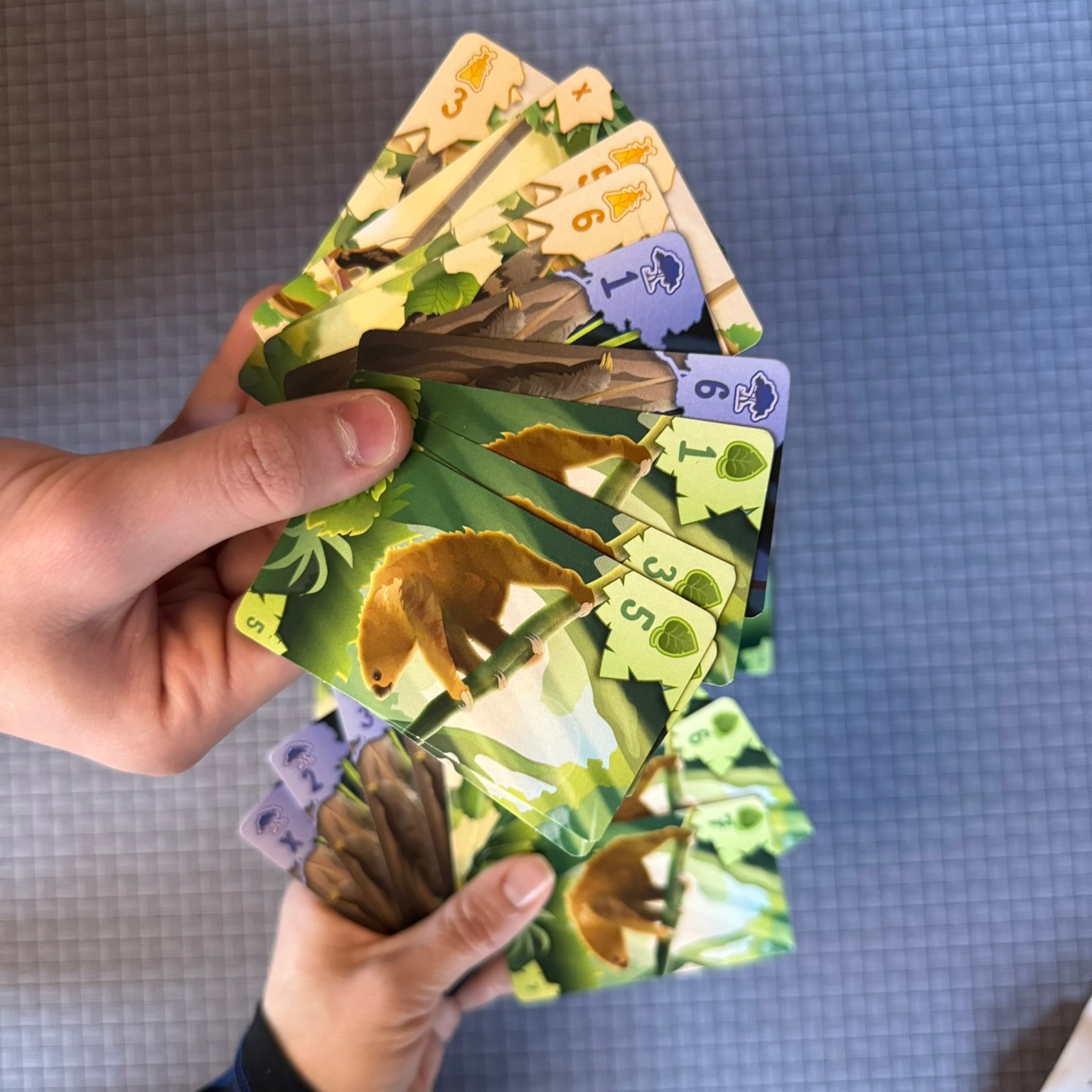 Lana’s Logbook: Surplus of Sloths was easy to learn and a delightful game. I love weighing the decisions of which sloth to rescue… I just want to make them all happy sloths! The clever twist here is finding the balance of collecting high cards, but that leaves lower cards to score. Do I want to collect high number cards to guarantee the win of the run? If I do, that leaves low numbers to score in the end. Collecting those Wild X cards is certainly easy… but they can add a hefty amount of bonus points at the end if in the Surplus Net. For an added twist, add the baby sloths into the deck. I love that this game isn’t as simple as “Collecting high cards, you win!” The balance each player has to find between which sloths to collect, which high cards to keep, and which ones fall to the surplus creates a delightfully thinky game, yet it is easy to learn and easy to teach. Everyone loved it!