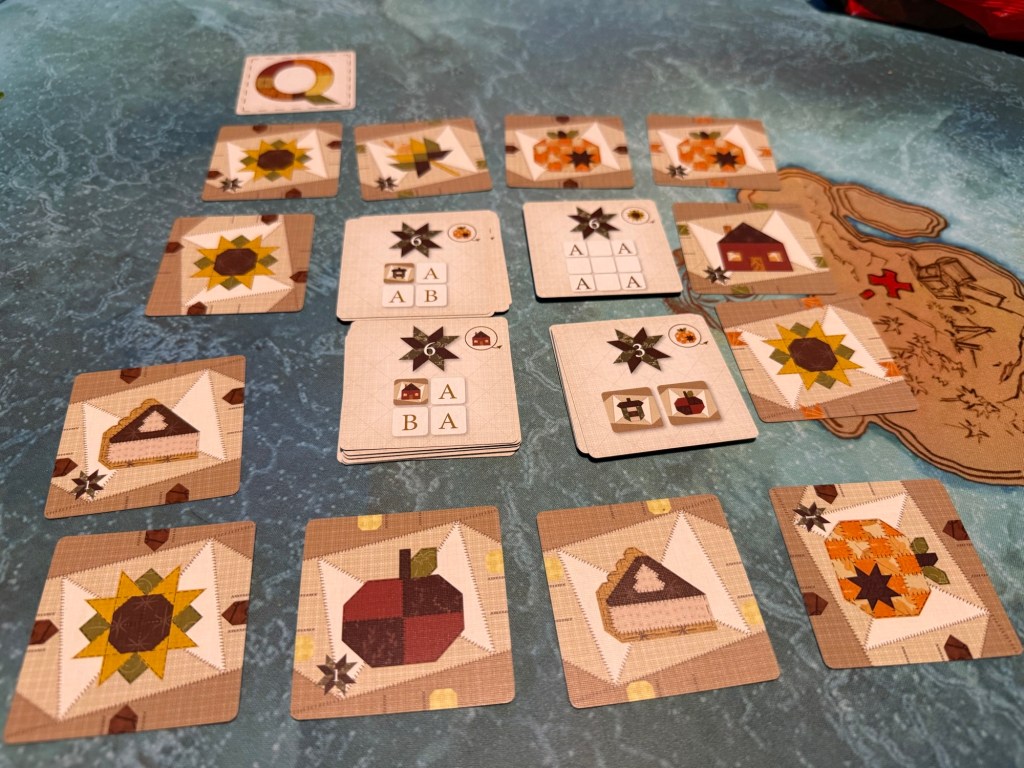 Visual, Vessels, and Treasures: A surprisingly nice treasure is the minimal language dependence. Suppose it’s a young player still learning to read, or a different language is spoken. In that case, this game plays into the visual side instead of reading dependency. From the box cover to each card in Quiltable, it feels like it was designed by a quilting expert. The look of the cards, especially when placed in the players’ quilts, feels like you’ve pieced together your story through these stitching memories. Early in the game gives that feeling I mentioned previously of sitting around a quilting bee, and the end game is walking through a county fair of quality quilts.