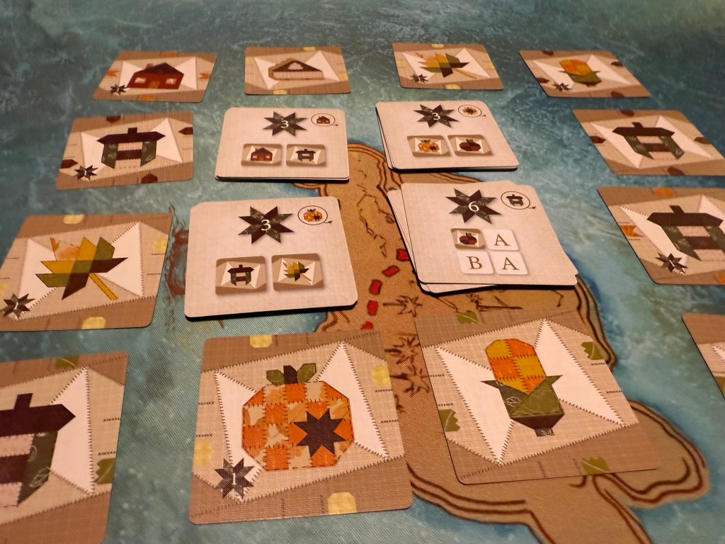 To set up a game of Quiltable, place the pattern cards in about four equal piles. Then, turn 12 cards to the quilt block side, surrounding the pattern cards. The player with the most colorful socks begins!