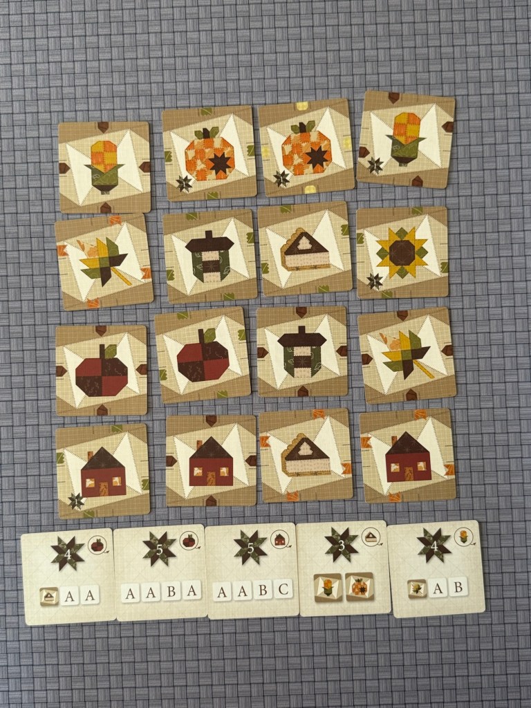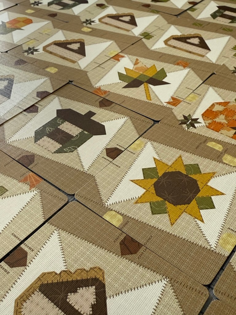 Strategic Depths & Tactical Choices: The game has a quick-paced flow. Possibly, there are times when someone is stuck in “Analysis Paralysis” for their next step; there isn’t too much time wasted between player turns. There are many moments in this game where you start with a plan, literally, with a plan you have chosen, and as the game progresses, you realize this is not going your way. Players must decide whether it is worth continuing with the original plan or shifting directions if the quilt piece they need isn’t coming up in the quilting area. More decisions arise when you must decide to go for more minor points and easier-to-achieve quilt pieces in larger quantities or the larger points with intricate patterns to create in smaller amounts.
