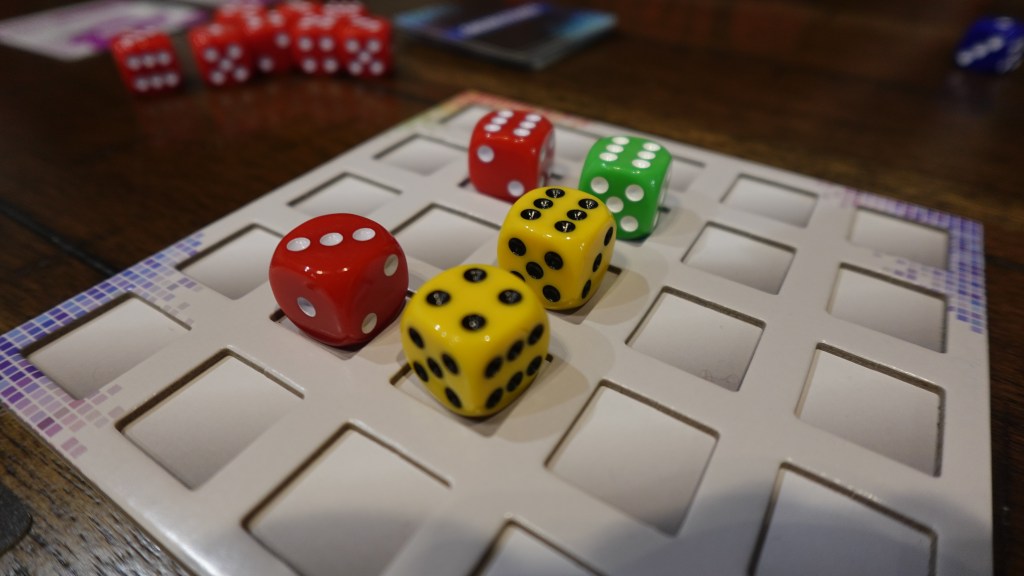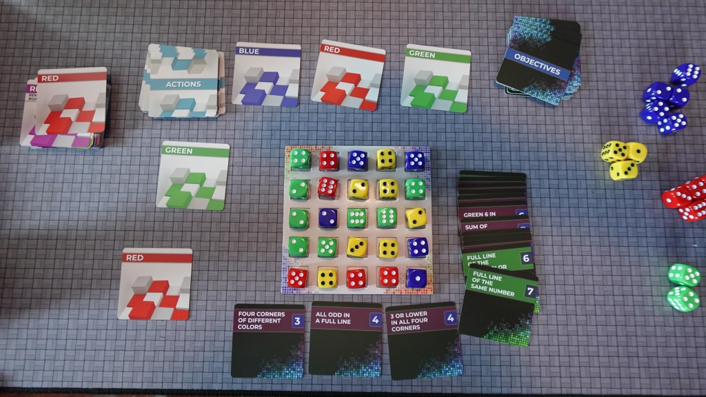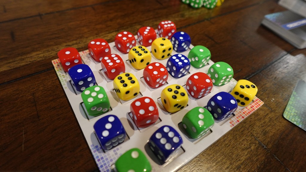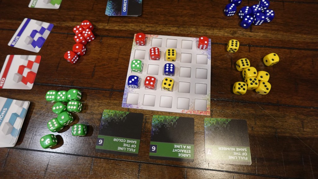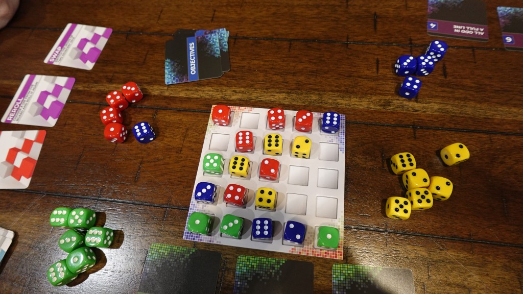 Strategic Depths and Tactical Choices: With four cards in hand, there are enough choices to create progress each turn and begin planning ahead for your next move. While your opponents are working on their own goals and changing the dice, the 25 square spaces create enough space between moves that I don’t feel boxed out of a move every single round, either. Suppose I notice a pattern that another player is working on. In that case, I might temporarily shift my focus to another part of the board. Sometimes, you feel so stuck with zero beneficial action cards or objectives that it’s always possible to discard your hand and draw new choices. Sacrificing any dice movement during that turn can pay off in the long run.
