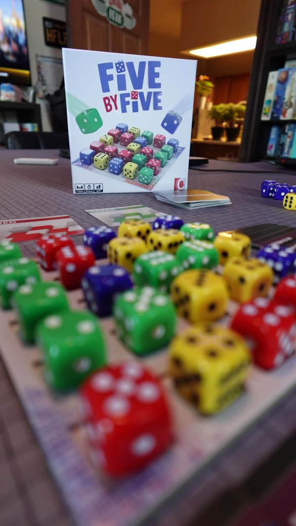 Five by Five is a fantastic game for a variety of ages and players. The light gamers found it within their comfort zone. In contrast, my more experienced hobby gamer friends took joy in managing the puzzle. During our recent game day, it was the perfect “filler game” between lengthier games and a great choice to finish off the night.