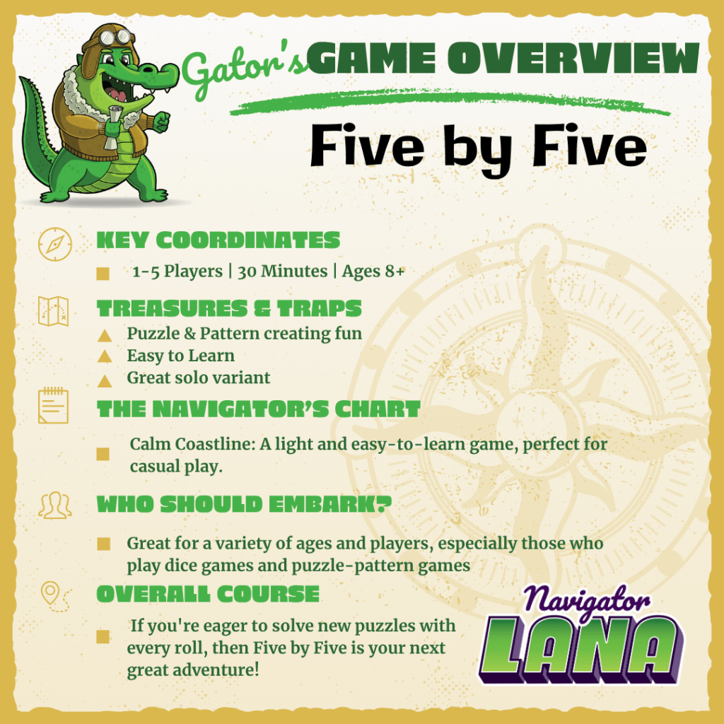 Our time with Five by Five has reached its final destination! This game is a compact treasure of strategic fun, sure to dice up endless replayability. If you’re eager to solve new puzzles with every roll and perfectly fill your board, then Five by Five is your next great adventure! You can add Five by Five to your own treasure hoard HERE!