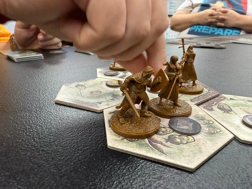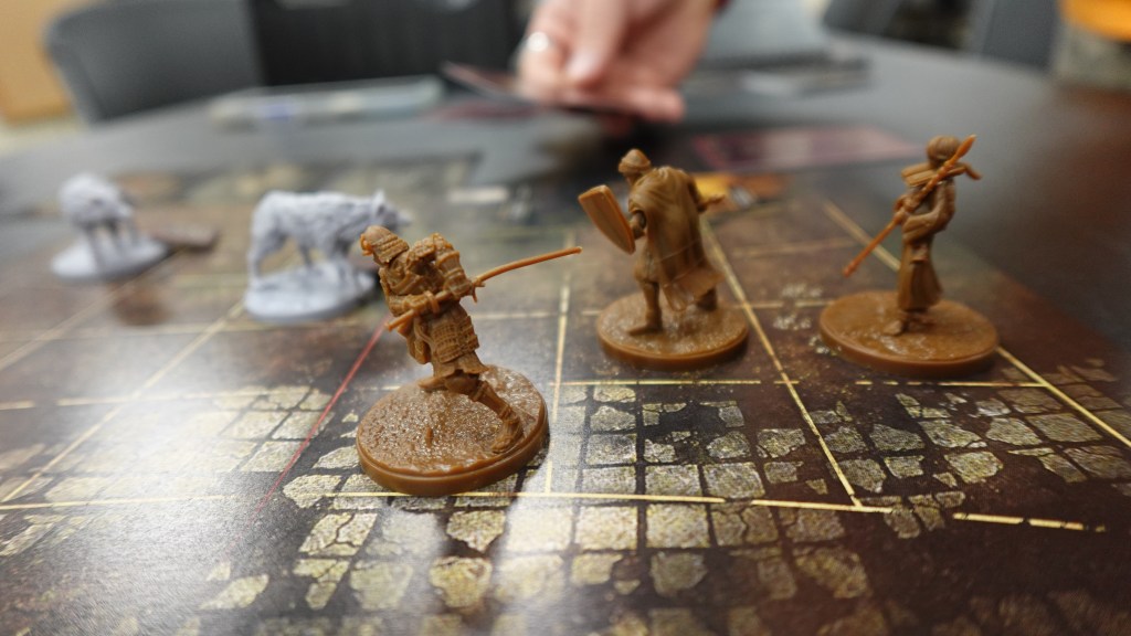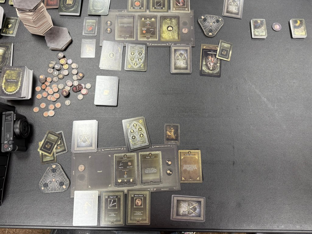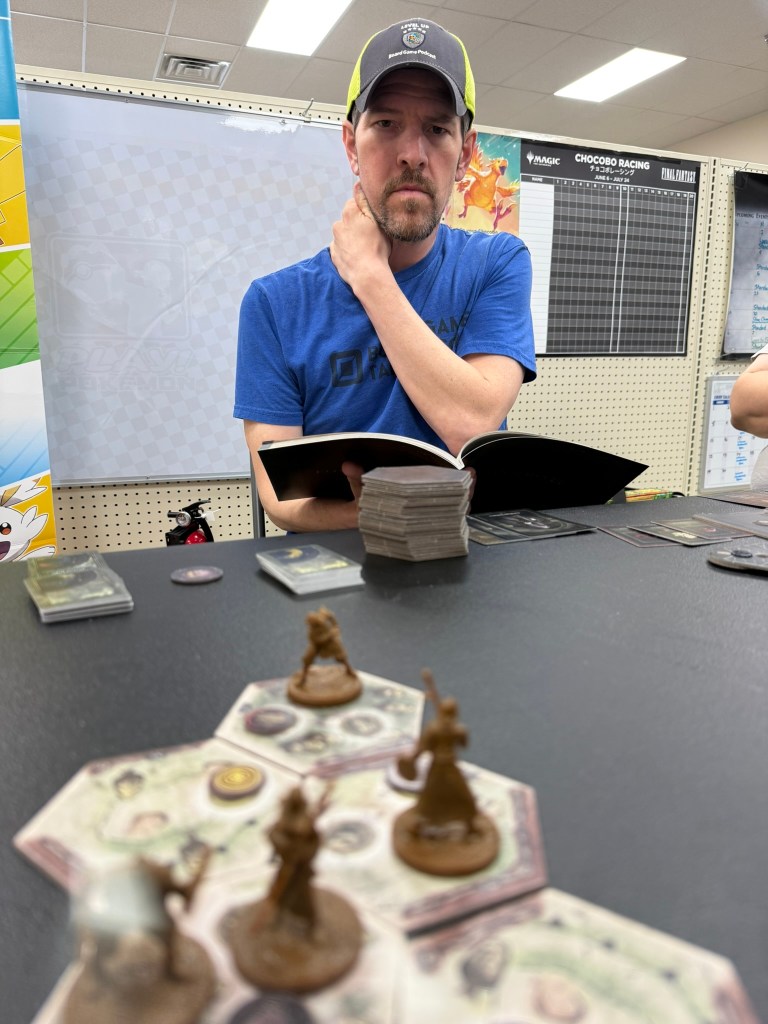 We went through about five scenarios and played from roughly 11:30 to 3:00. For 3.5 hours of gameplay, I would have expected at least one moment of being like, ‘Yeah, that was awesome!’ Yet, I didn’t find myself saying that. There was one point where it asked if we wanted to stop and talk to a roadside merchant. I mean a classic video game translation of the roadside NPC that will either sell you something or provide information. We read the encounter, and he says, “Oh well, let me give you this then”. We thought, “Cool, we are getting something! See, I knew it was a good idea to stop and talk to him.” What item do we receive? — “You might see some of my kin along the way” (add cards XYZ and XYZ to the massive event deck). That’s it? So, our item is shuffled into this 100-stack deck, so our chances are about 2% of reencountering it? Again, it felt lacking in those big “I did a cool thing” moments. After five scenarios, I expected more umph.
