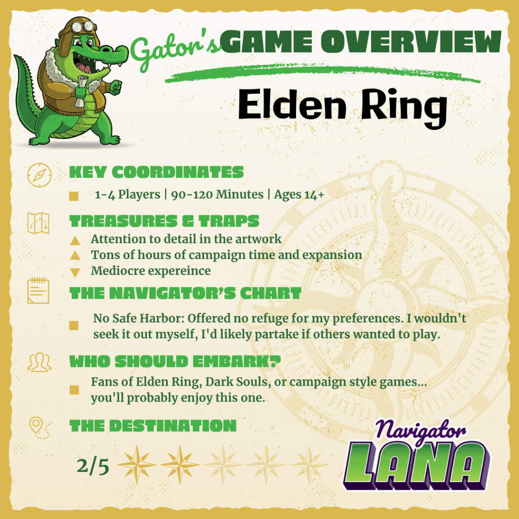 Overall, this one can keep on sailing past for me. I do believe that gamers who are faithful to Dark Souls or an Elden Ring fan will find the game enjoyable, especially when regularly played as a campaign, which is fine because that is likely the market for the game. As a hobby gamer not involved in the IP, I am perfectly content letting this one travel on. If someone offers to play it again, I wouldn’t turn it down. It wasn’t horrible by any means. However, I wouldn’t go out of my way to play this one again, or unquestionably would not purchase it for my collection. I feel some of the other big box campaign games, such as Roll Player Adventure or Kinfire Chronicles, hit the mark better.
